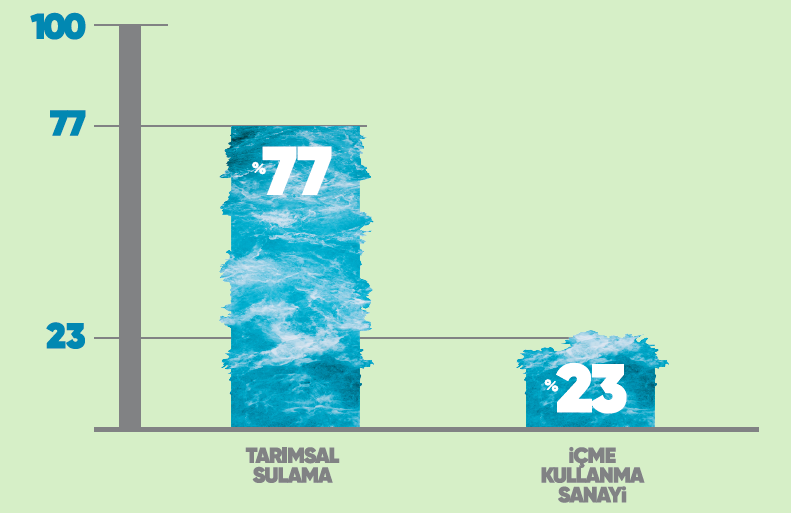 Bir tarafta aşırı su kullanımı diğer tarafta ise kuraklık var. Yarı kurak iklim özelliklerine sahip Türkiye’de yıllık ortalama yağış miktarı 574 mm, yıllık yağış miktarı 450 milyar metreküp olsa da iklim değişikliğine bağlı yaşanan kuraklık, tarımsal üretimi dolayısıyla gıdamızı tehdit ediyor. Bu nedenle suyun tasarruflu ve en elverişli şekilde kullanılması için her aşamada ve toplumun her kesiminde acilen politika, plan, yöntem ve yaşam tarzı değişiklikleri gerekiyor.