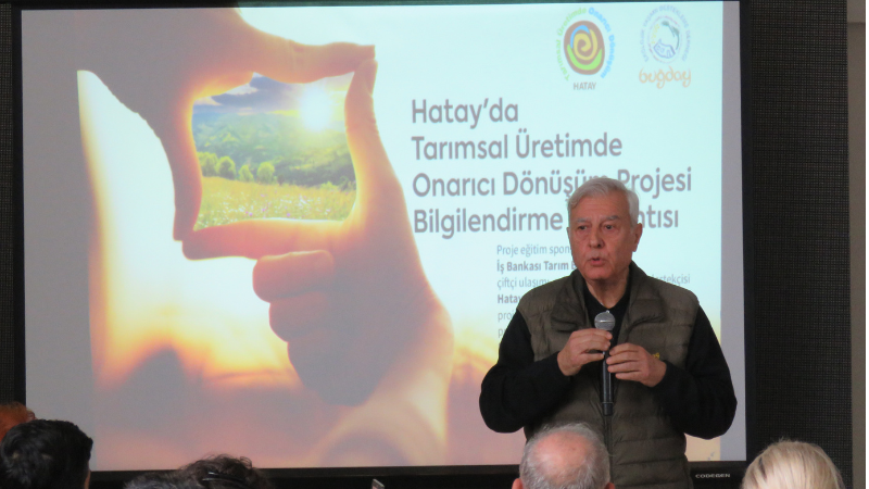 İki yıl sürecek “Hatay’da Tarımsal Üretimde Onarıcı Dönüşüm” projesine katılacak çiftçilere ve ürünlerini işleyecek kooperatif temsilcilerine yönelik olarak bugün Hatay EXPO Hortikültür alanında bir bilgilendirme toplantısı gerçekleştirildi. Proje faaliyetleri ile proje takviminin detaylarıyla aktarıldığı toplantıda konuşan Buğday Derneği Strateji Kurulu üyesi, Oya Ayman projenin amacını şu sözlerle ifade etti:
